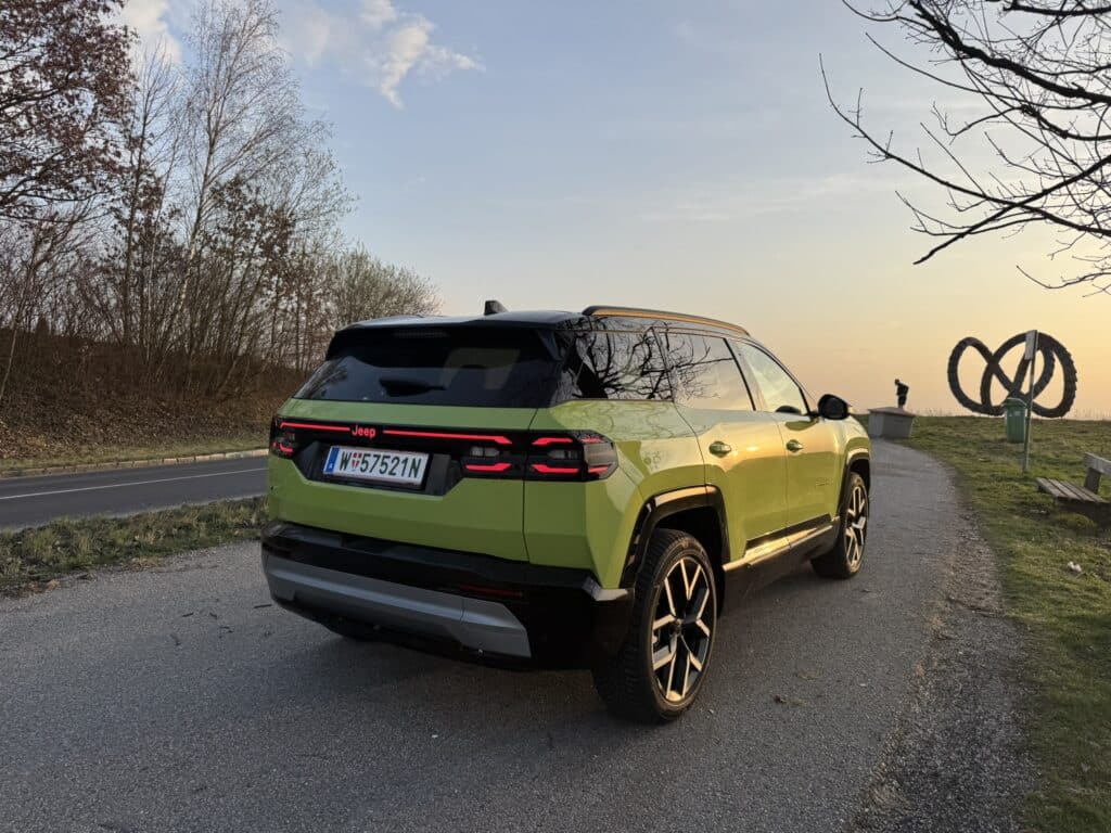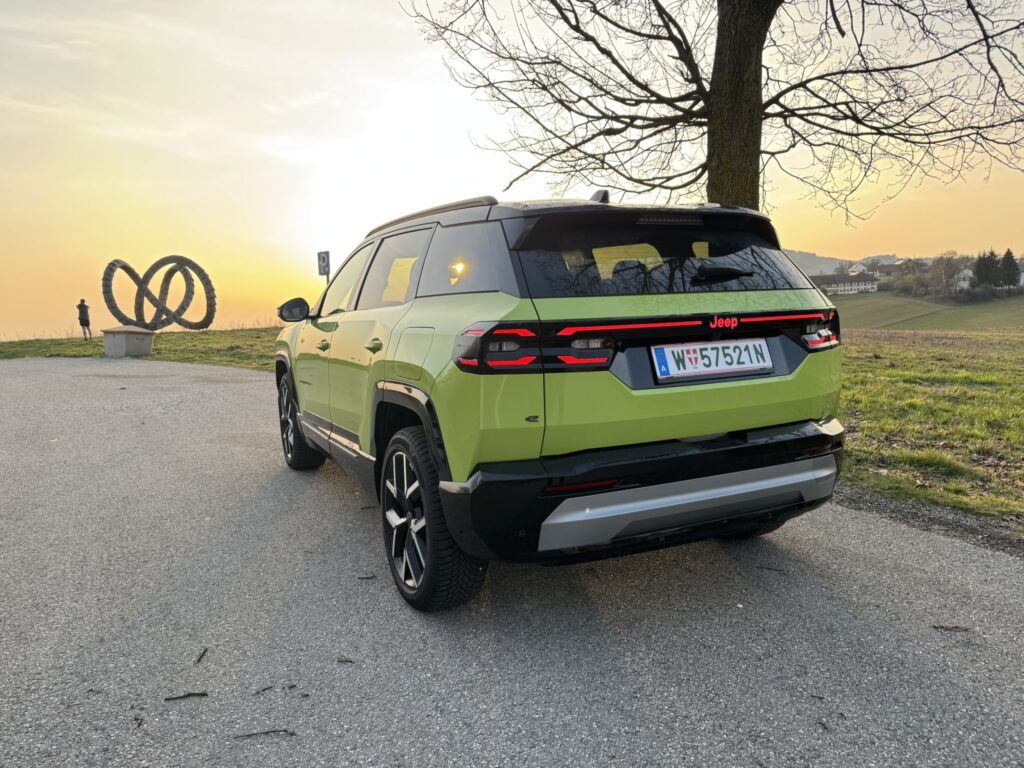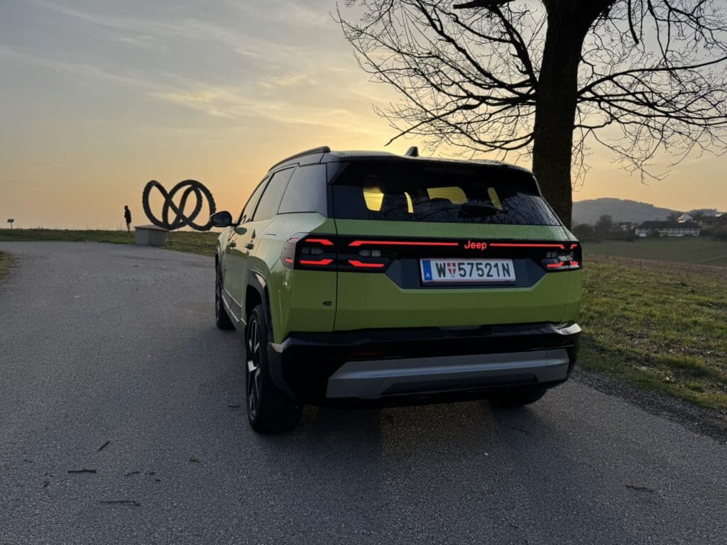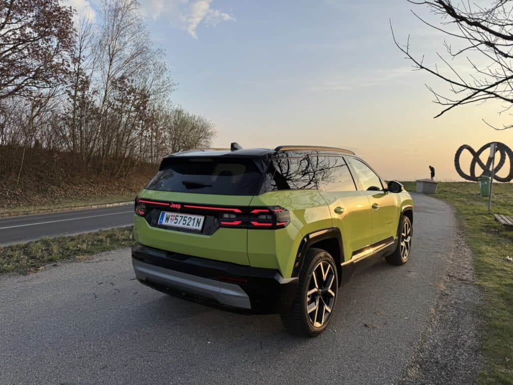 Schon beim ersten Blick ist klar: Das hier ist kein glattgebügelter Peugeot 3008-Ableger. Der Compass E setzt bewusst auf Ecken, Kanten und die ikonische – hier sanft illuminierte – Jeep-Front. Das Design wirkt kantig, fast schon trotzig – ein klarer Gegenentwurf zu den Formen seiner Stellantis-Geschwister.