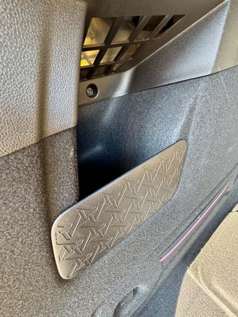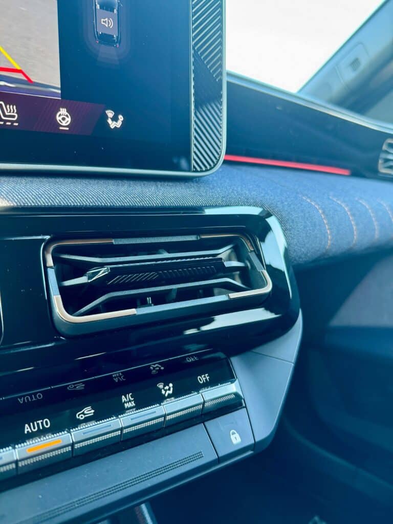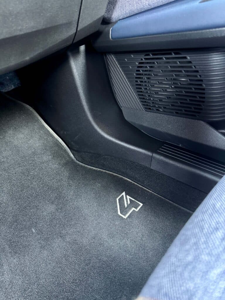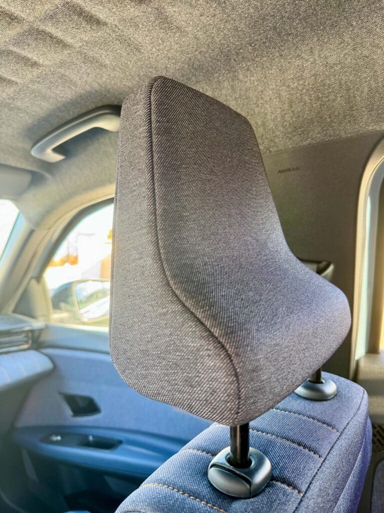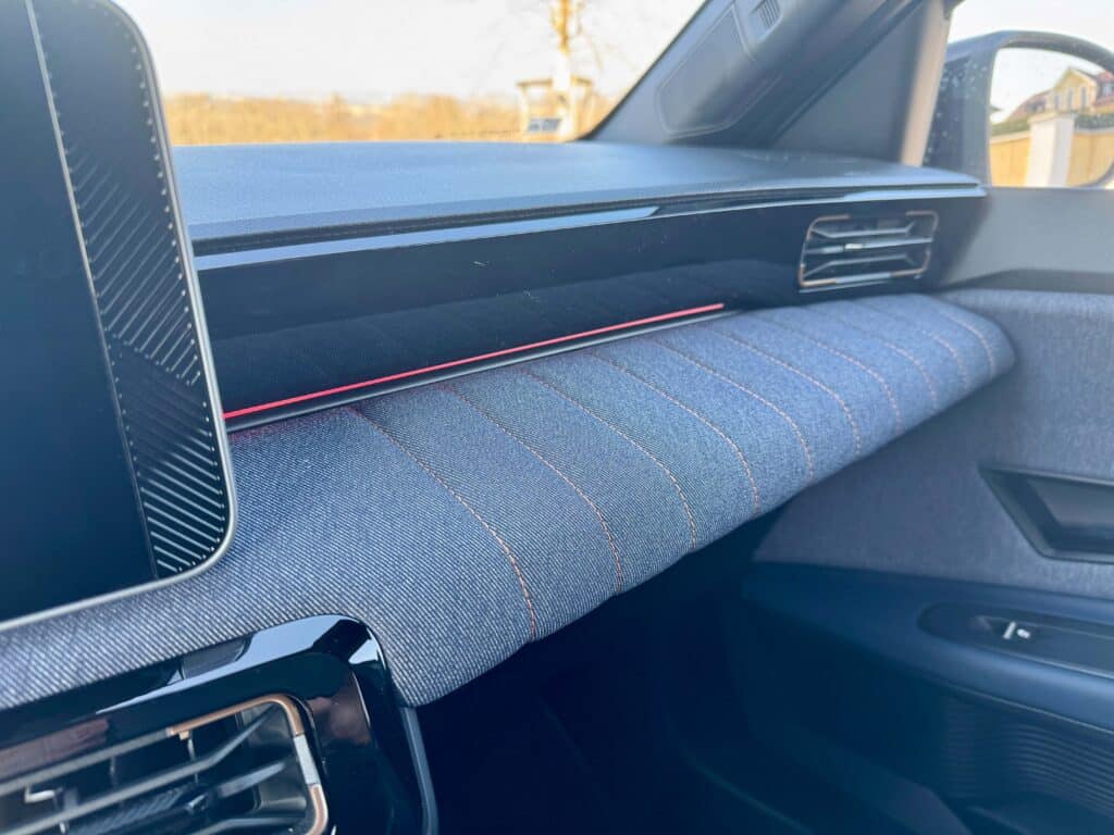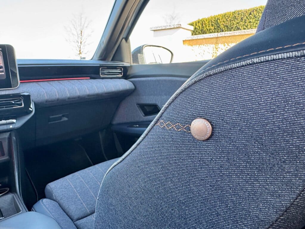 Innen dann der nächste Aha-Moment: Jeansstoff! Kein Schmäh. Sitzbezüge und Armaturenbrett aus recyceltem Stoff – schaut gut aus, fühlt sich wertig an und gibt dem Ganzen einen ganz eigenen Vibe, Dort eine Naht, da ein Knöpfchen, coole Sache finden wir.