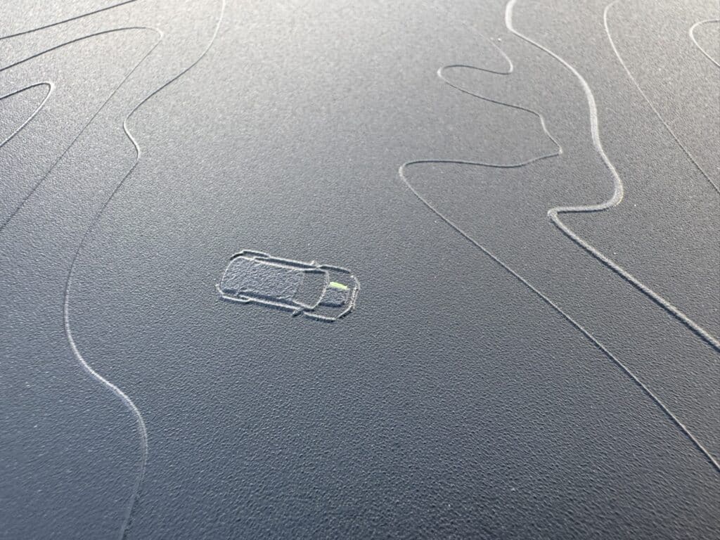 Und typisch Jeep sind auch die liebevollen Easter-Eggs: In der Windschutzscheibe findet man die Silhouette eines alten Willys-Jeep, und auf der Motorhaube sitzt ein kleiner Jeep-Schriftzug sowie das Auto von oben gesehen in einem angedeuteten Offroad Gelände. Solche Kleinigkeiten zeigen, dass Jeep viel Wert auf Liebe zum Detail legt.