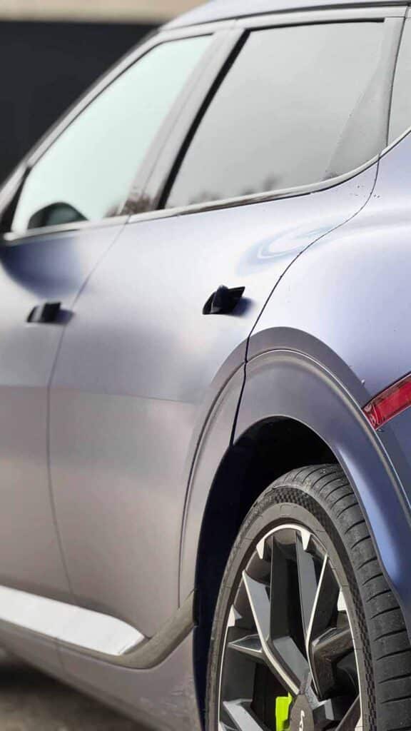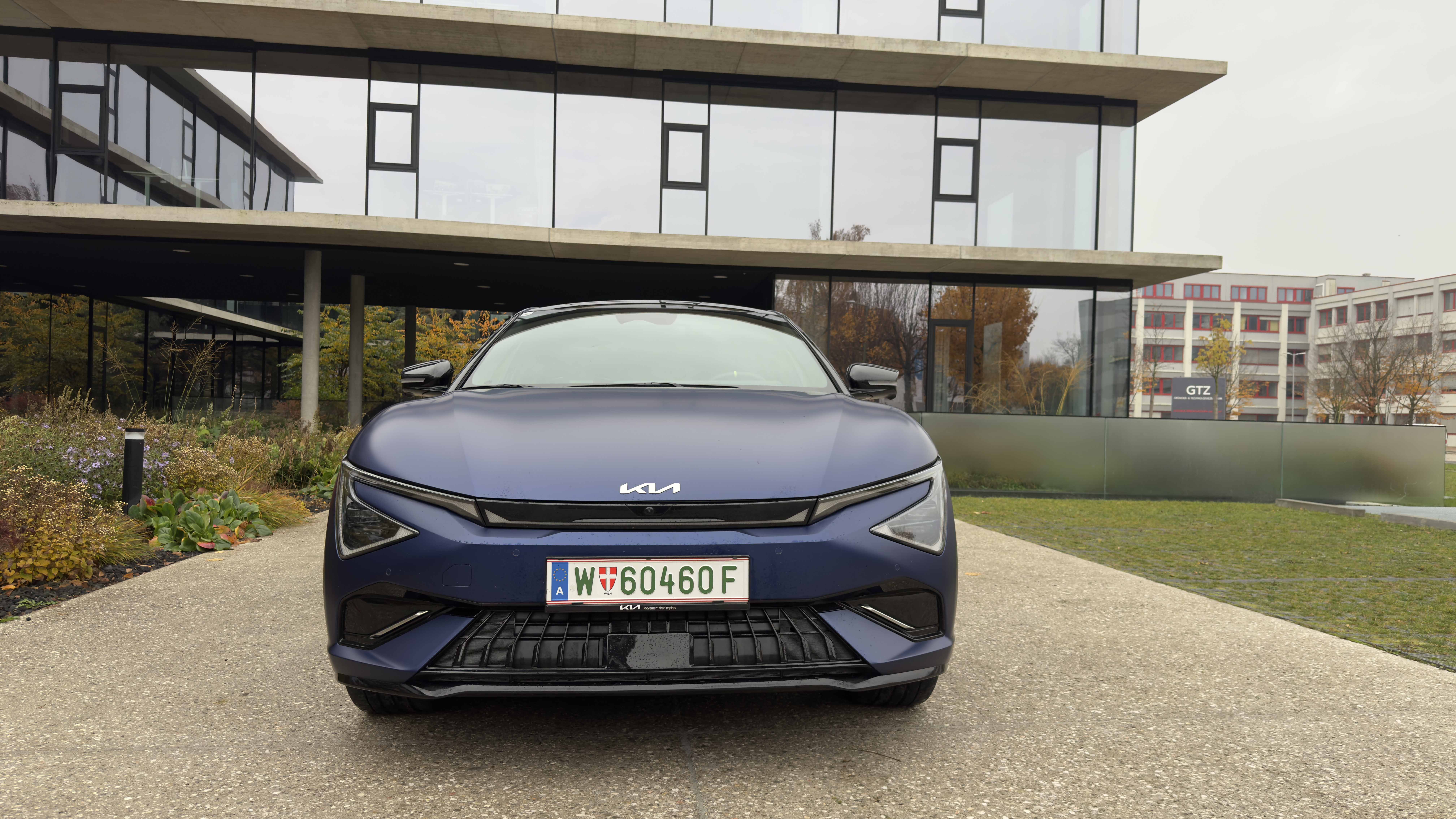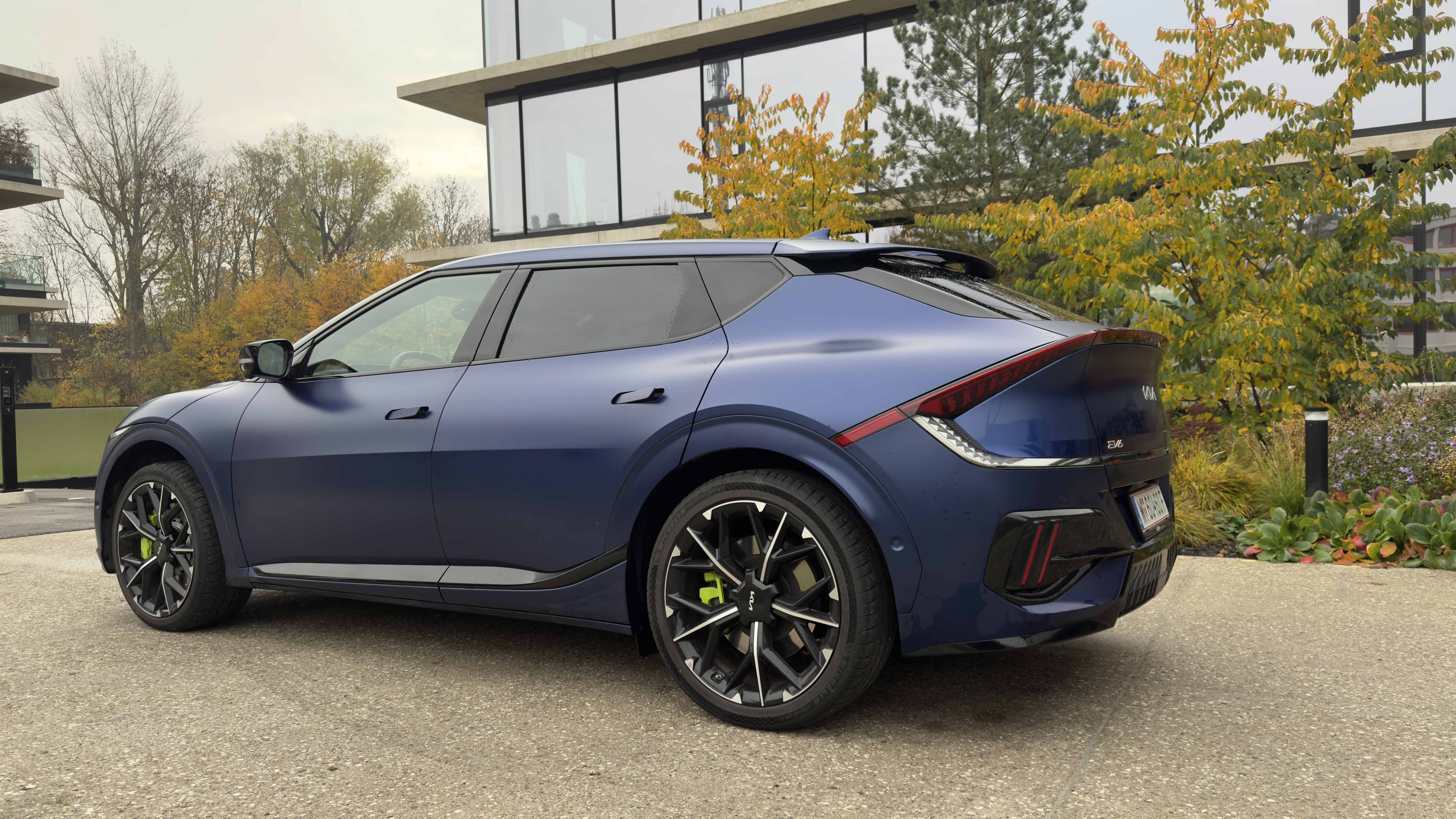 Der EV6 GT zeigt sich sportlich und edel zugleich: markante Linien, große Felgen, neonfarbene Bremssättel, GT-Akzente außen wie innen. Unser Testfahrzeug war zudem in Yachtblau matt lackiert – macht definitiv was her. Der Innenraum überzeugt mit Premiummaterialien, Schalensitzen vorne und modernem Cockpit mit den üblichen großzügigen Displays.