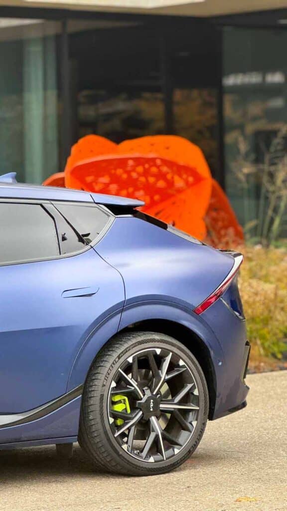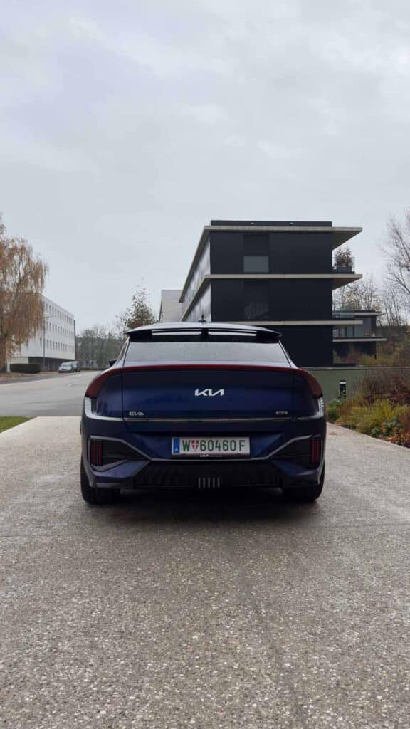 Trotz aller Sportlichkeit ist das Fahrzeug im Alltag höchst angenehm nutzbar: gute, rückenschonende Sitze, ordentlicher Komfort, man muss definitiv nicht leiden im Kia EV6 GT. Allerdings merkt man auch: Gewicht, große Felgen und sportlicher Anspruch bringen Kompromisse mit sich – z. B. ginge bei der Federung durchaus mehr, wenn man auf die Riesenräder des GT verzichten würde – aber wer macht das schon. Dies betrifft auch den Verbrauch.