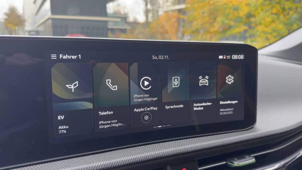 - Die Anzeige im Fahrzeug zeigte bei volle Ladung eine Reichweite von ca. 375 km, realistisch erreichten wir aber eher ≈ 300 km, je nach Fahrweise.