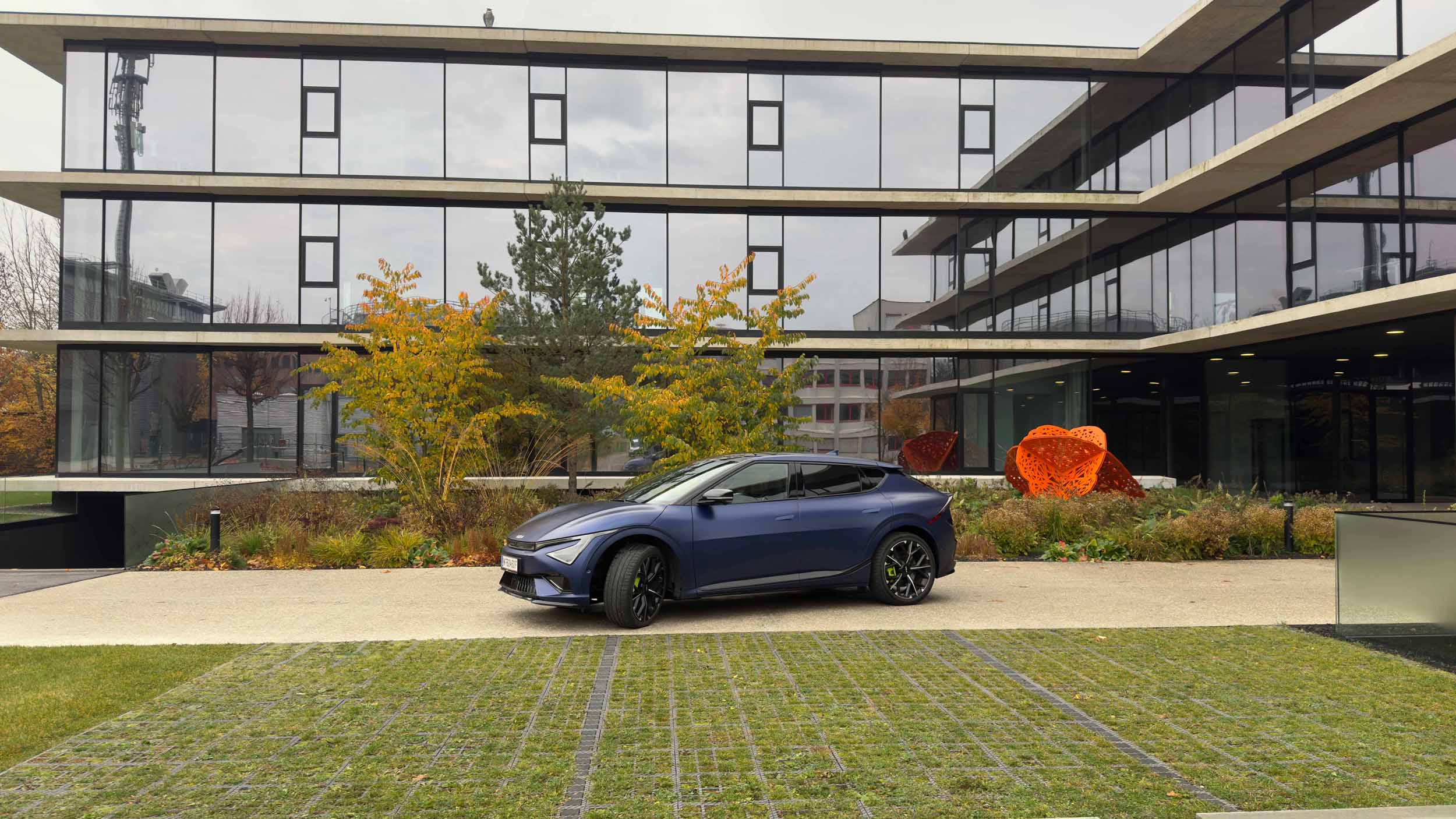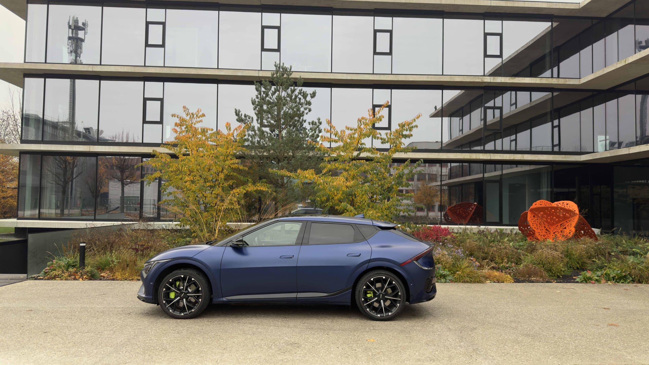 Der EV6 GT zeigt sich sportlich und edel zugleich: markante Linien, große Felgen, neonfarbene Bremssättel, GT-Akzente außen wie innen. Unser Testfahrzeug war zudem in Yachtblau matt lackiert – macht definitiv was her. Der Innenraum überzeugt mit Premiummaterialien, Schalensitzen vorne und modernem Cockpit mit den üblichen großzügigen Displays.
