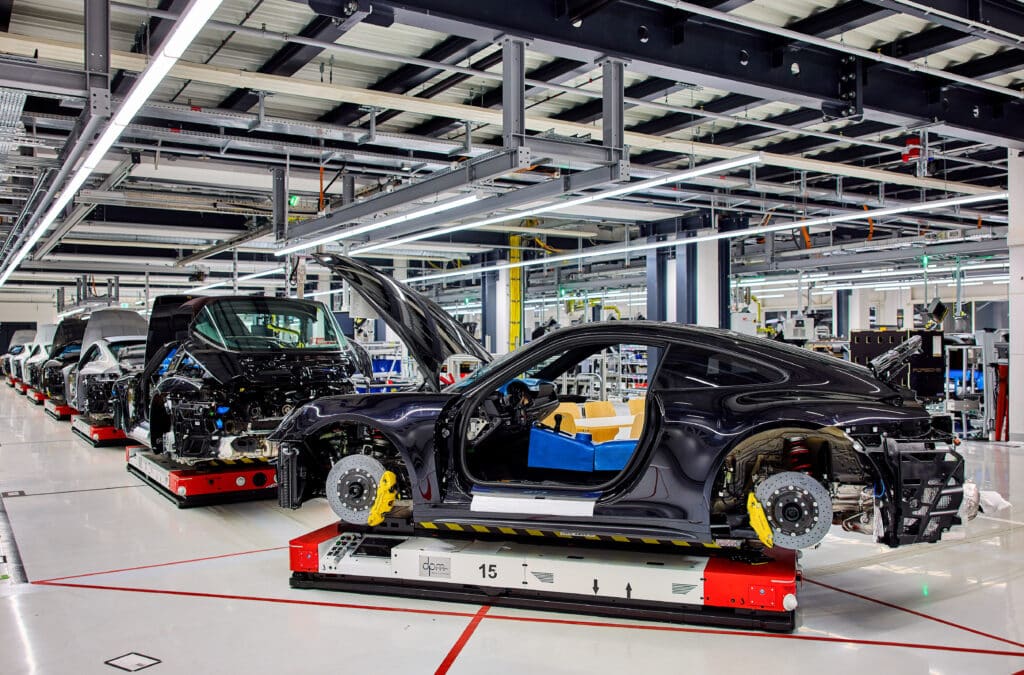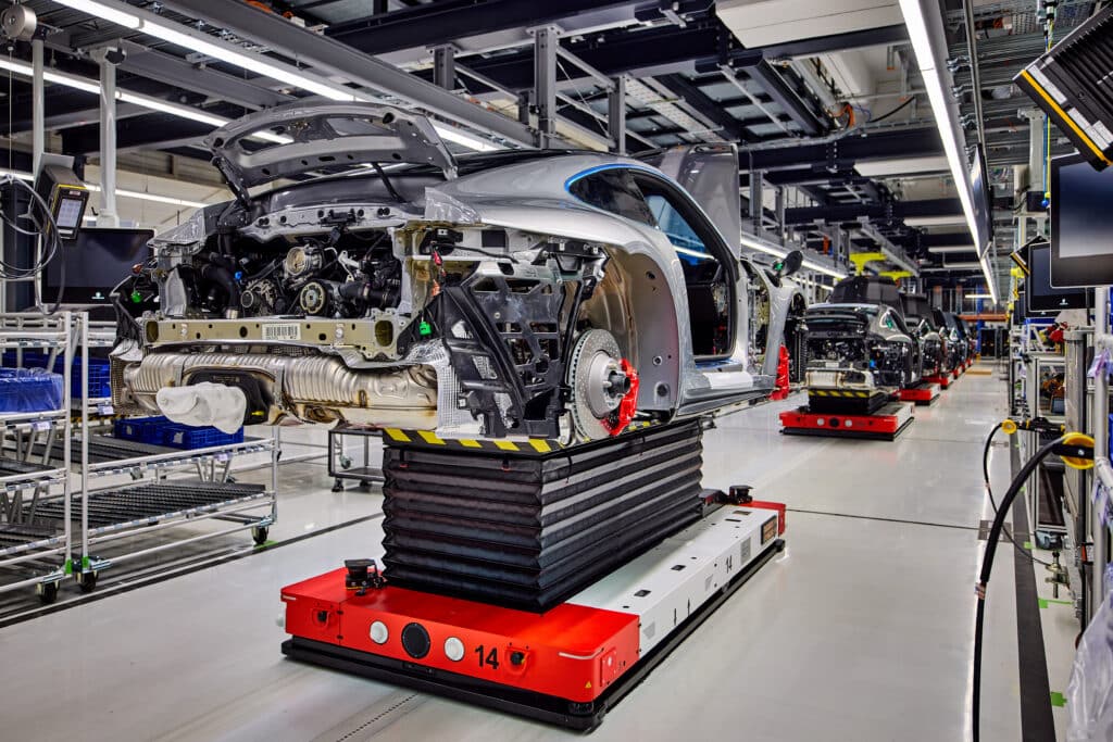 Zur Optimierung der Abläufe kommen auch bei Porsche fahrerlose Transportfahrzeuge (FTF) zum Einsatz. Die FTF der neuesten Generation ersetzen auf einer sogenannten „Flexiline“ das klassische Fließband und erlauben so eine noch variablere Produktionsweise – was gerade auch mit Blick auf die künftige Mix- Produktion von Fahrzeugen mit Verbrennungsmotoren und Elektroantrieben auf einer Linie von Vorteil ist.