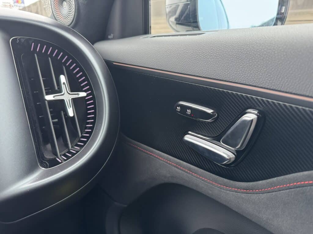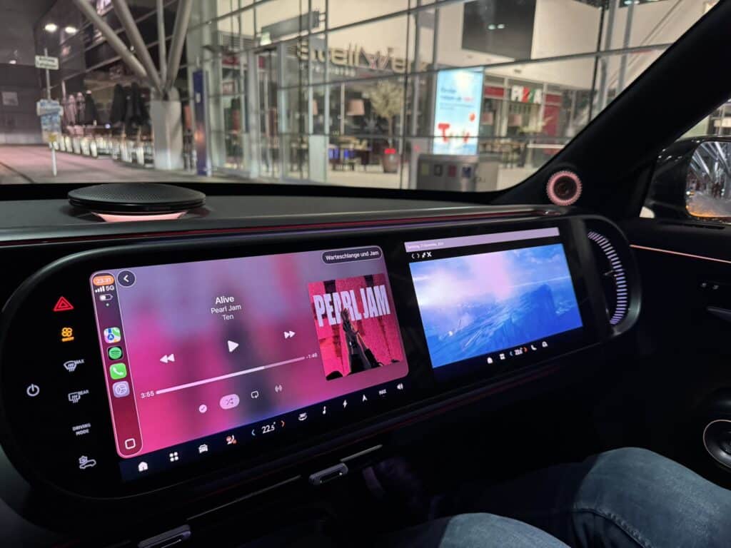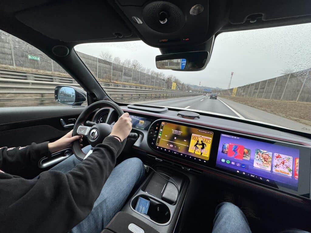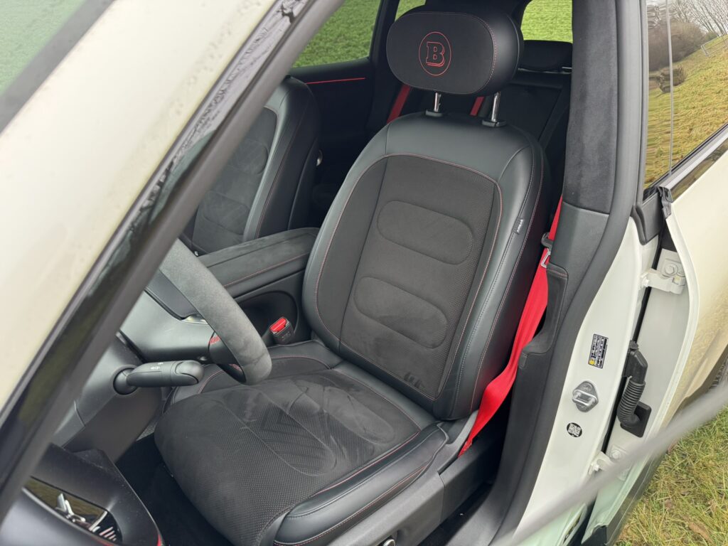 Innen dominieren gleich drei Bildschirme. Der übliche Infoschirm hinterm Lenkrad, die Mitte für die Bedienung des Infotainments und ein gleich großer Screen vor dem Beifahrer, der dort für Bespaßung mittels Streaming & Co sorgt. Das Ambiente in der Brabus-Version wurde eindeutig auf Sport gebürstet – sehr fein fanden wir das mit Alcantara bezogene Lenkrad und die perfekt geschnittenen Sportsitze, welche ebenfalls mit diesem Material überzogen waren. Die Materialauswahl ist generell sehr gelungen – sogar dort, wo man nicht gleich hinschaut findet man ordentliche Kunststoffe. Das hat schon sehr viel Klasse.
