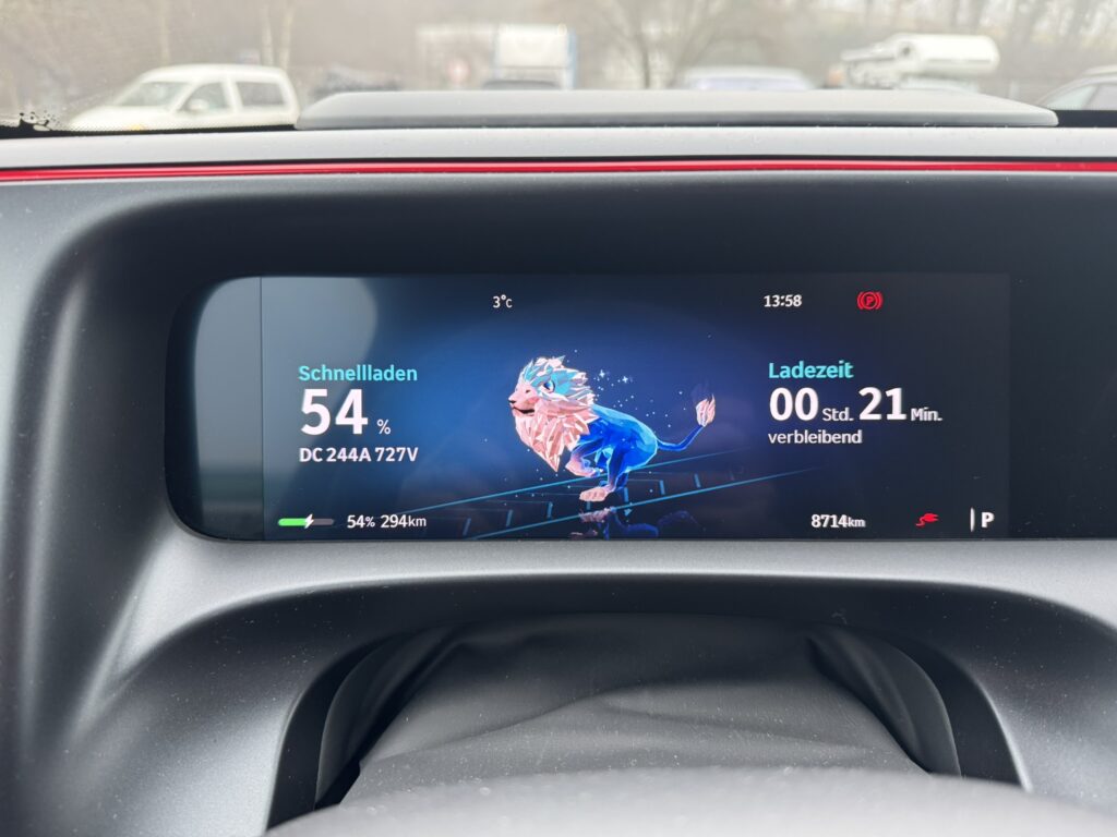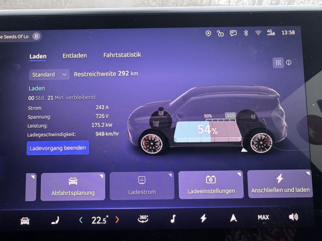 • Unsere Reisegeschwindigkeit hat sich bei rund 120 bis 130 km/h eingependelt – dadurch konnten wir einen Verbrauch von rund 27 kW/100 km erreichen. Gerade auf der deutschen Autobahn hat das schon ein bissl geschmerzt, mit über 600 PS so dahin zu kriechen aber sonst hätten wir mangels Ladeinfrastruktur an der Autobahn einen Schnelllader tief im bayrischen Hinterland ansteuern müssen. So aber sind wir nach dem Match mit 8 Prozent SoC bei einer Schnellladesäule im oberösterreichischen Ranshofen aufgeschlagen um uns für die restliche Heimfahrt zu wappnen.