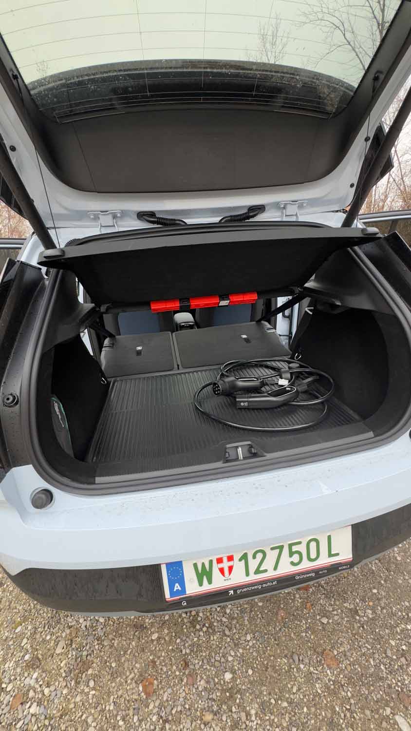 - Die offiziellen Werte für Reichweite lauten etwa 425 km nach WLTP für diese Variante. In der Praxis – mit unserem Mix aus Stadtverkehr, Landstrasse und gelegentlicher Autobahnfahrt – bewegten wir uns im Schnitt bei etwa 18–20 kWh/100 km – das heißt bei einer nutzbaren Batteriekapazität von ca. 64–69 kWh kann man realistisch mit etwa 300–350 km Reichweite rechnen, je nach Fahrstil. Das passt gut zu Vergleichswerten von Testmagazinen (z. B. Verbrauch um 19,5 kWh/100 km)
