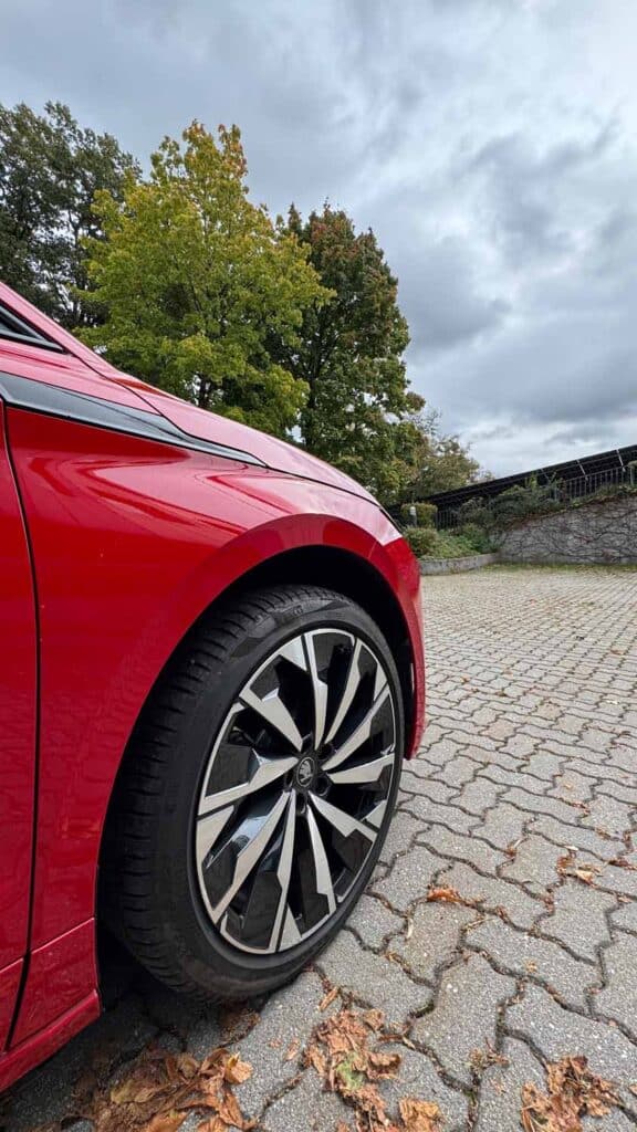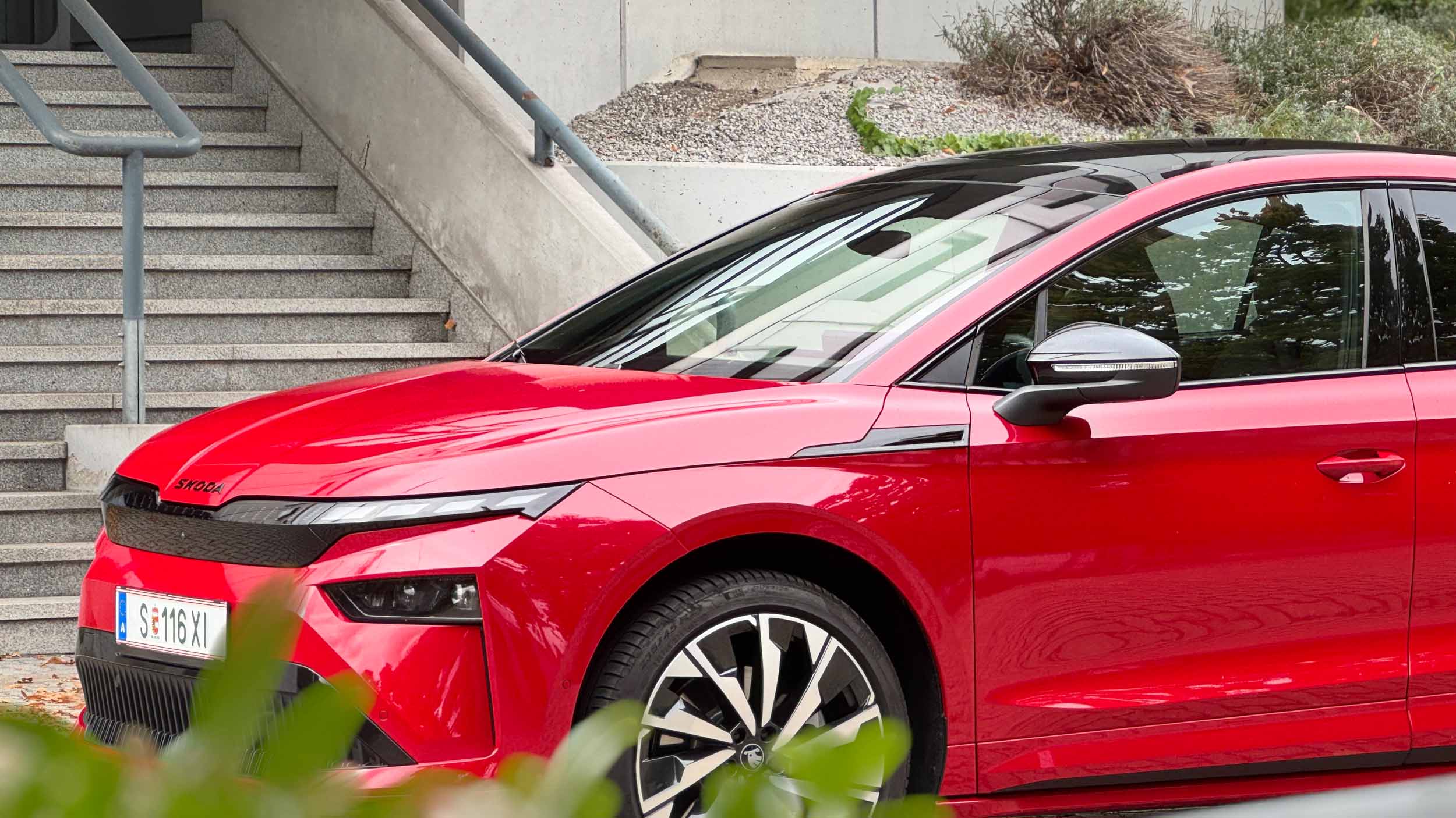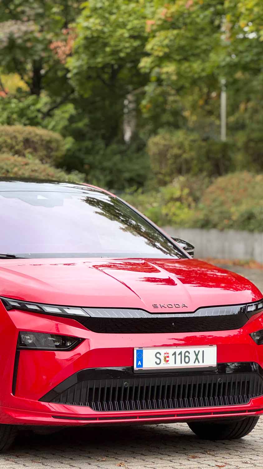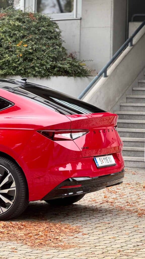 Wer elektrisch sportlich, aber nicht kompromisslos unterwegs sein will, findet hier einen Daily-Driver mit Stil. Ganz ehrlich: Wer sagt, Elektro kann nicht sexy sein, hat diesen Enyaq noch nicht gefahren. Ich selbst wurde 3x angesprochen, wie schön das Auto da steht, vor allem in diesem Rotton der ihm einfach unglaublich gut passt. Rote Autos sind wie gelbe Autos, das muss passen, hier stimmt`s einfach vom Dach bis zu den Pneus.