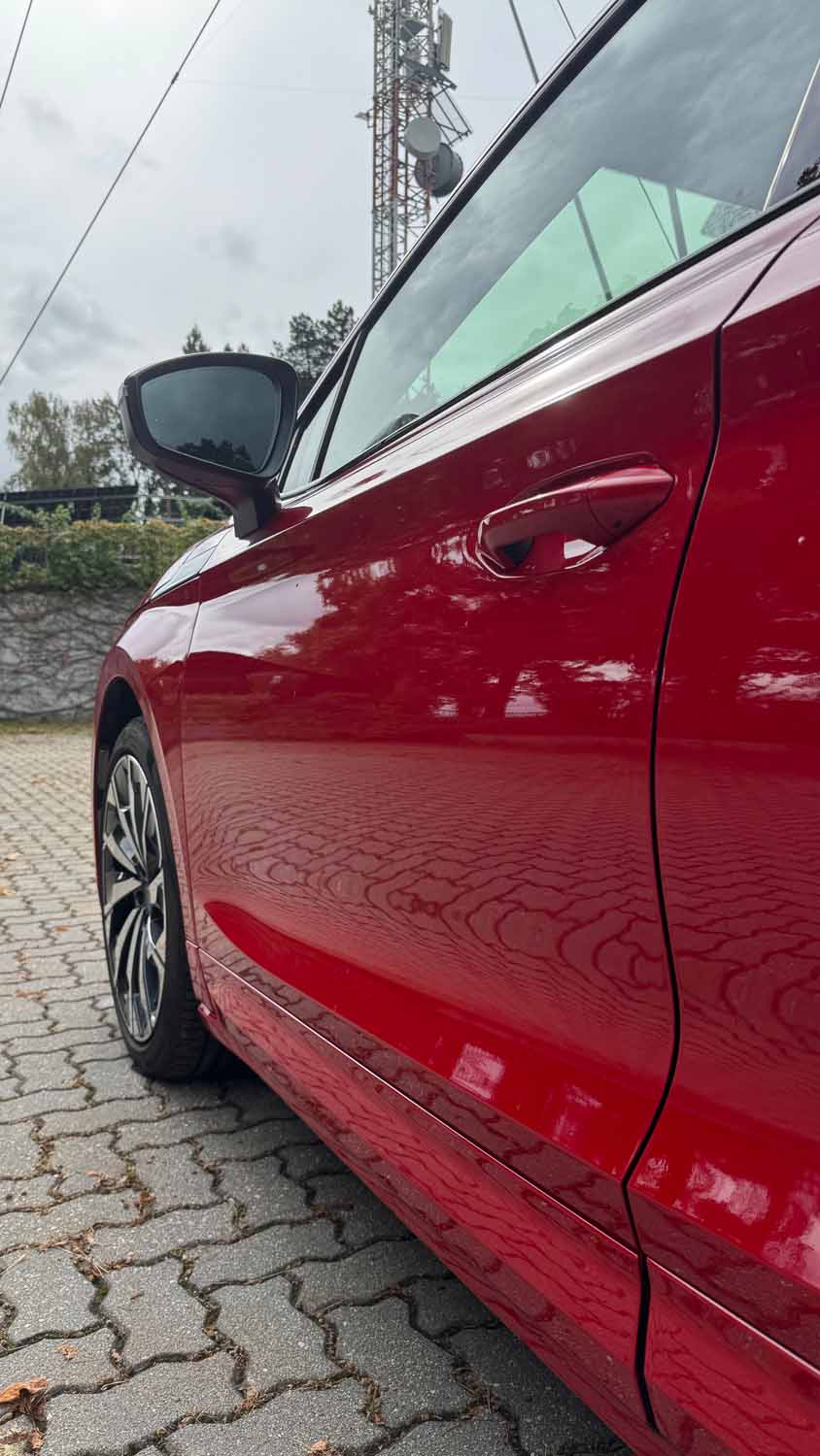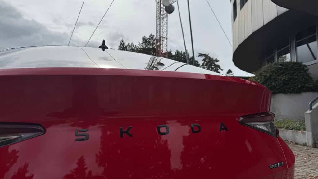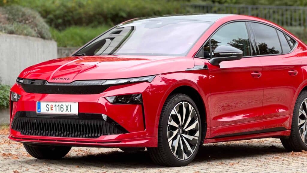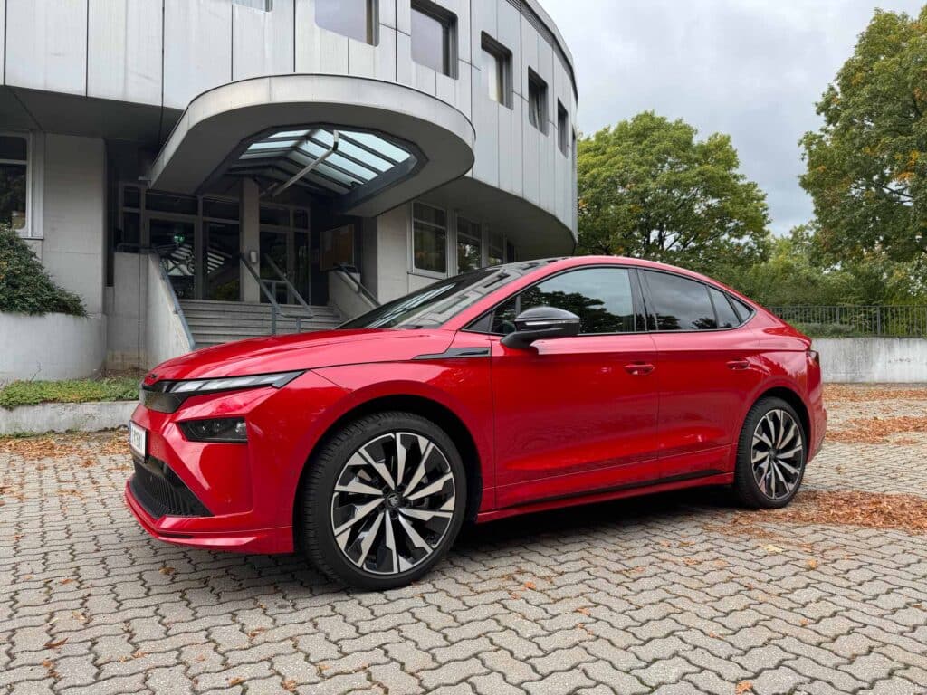 Schon beim ersten Blick merkt’s: Der Enyaq Coupé Sportline meint’s ernst. Velvet-Rot Metallic, 21-Zöller in Supernova-Optik und ein Dach, das flacher abfällt als die Stimmung beim Montagmorgen. Das ist kein „ich kann alles“-SUV, das ist ein „ich will mehr“-Coupé.