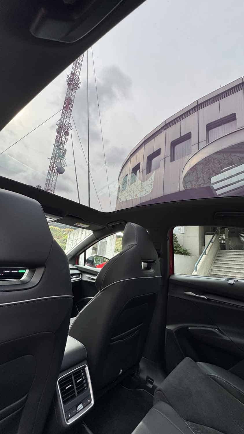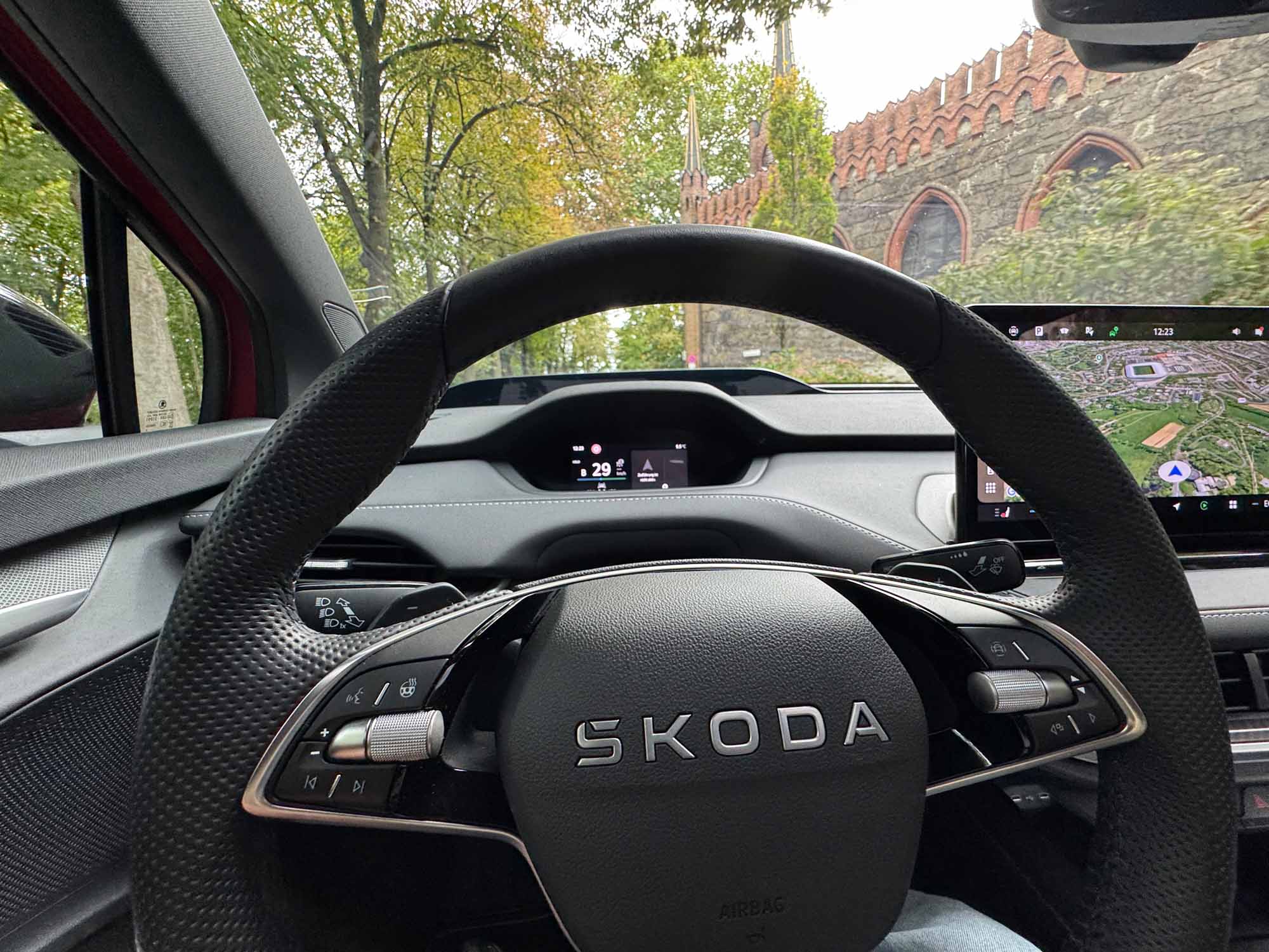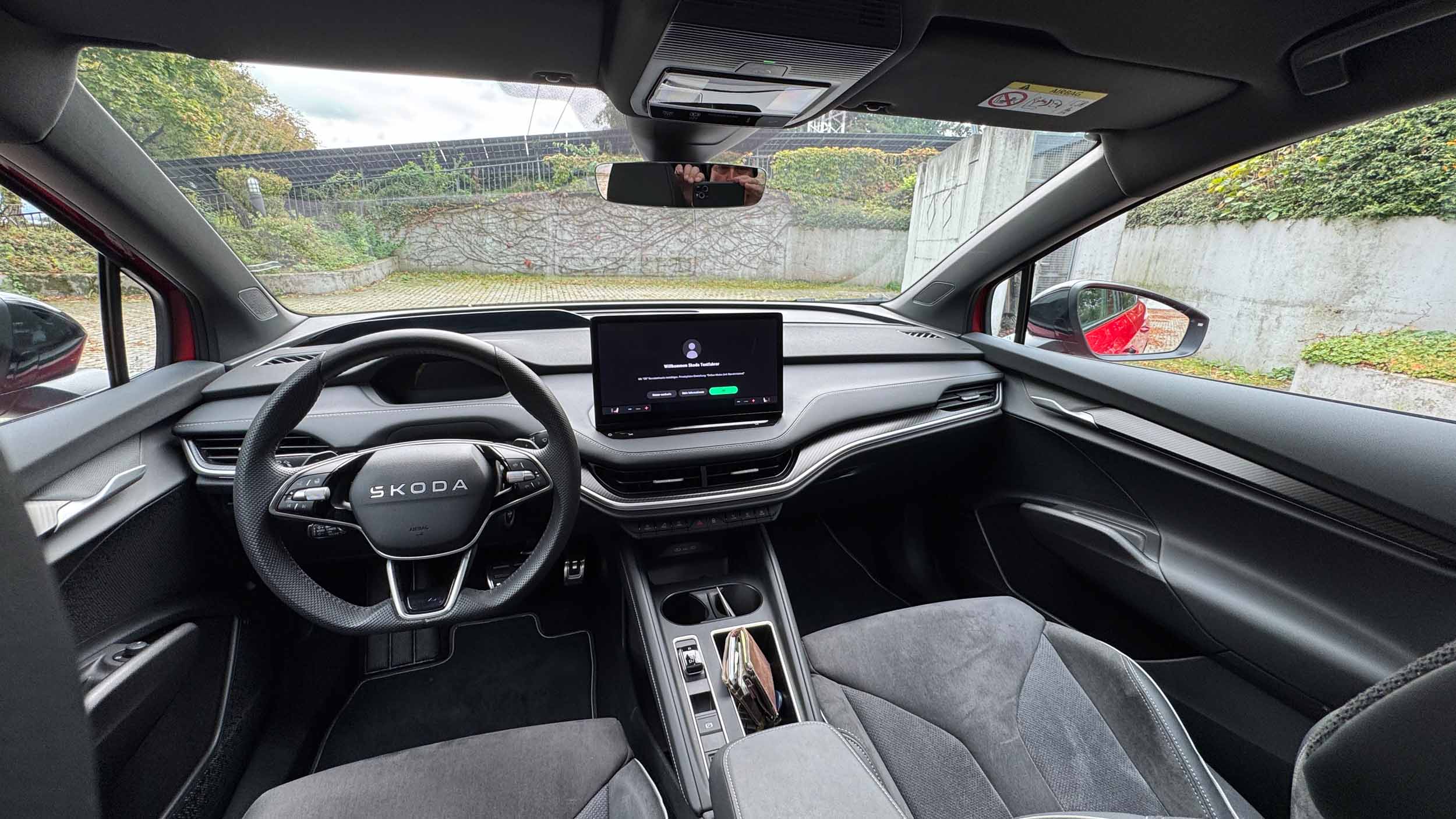 Das Sportline-Paket bringt alles mit, was das Fahrerherz höher schlagen lässt: Schwarze Akzente, animierte LED-Matrix-Leuchten, Panoramadach und Interieur in Schwarz-Grau. Der Look? Aggressiv, aber nicht aufdringlich. Wie ein Maßanzug mit Sportschuhen. Wir finden die Schreibweise des Wortes Enyaq richtig nice, tippt mal das Wort in eure Tastatur, wie schön sich die Buchstaben nach den Enyaq nach oben ziehen, verzeiht ein kleiner Auszug aus Design und Schriftensprache.